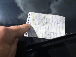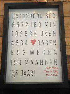 En dan de reden voor de titel van deze blog. Gisteravond ben ik met de Zoe naar Station Prinsenbeek gereden, daar de trein gepakt naar Tilburg en na het etentje zijn Kitty en ik naar huis gebracht door Remy en Daniëlle. Dus de auto moesten we vandaag nog even ophalen nadat we het koopcontract hadden getekend. Aangekomen bij de auto, zie ik een briefje achter de ruitenwisser zitten. Ik denk “shit nee hè, toch geen schade?”. Kitty loopt direct naar de zijkant van de auto terwijl ik het papiertje onder de ruitenwisser vandaan pulk. Blijkt het een felicitatie te zijn voor ons jubileum gisteren!! Melissa, de zus van Femke, was blijkbaar gisteravond in de buurt en wilde ons verrassen, nou dat is gelukt! Zij heeft zich al eens eerder heel geïnteresseerd en betrokken getoond, ook al heeft ze zelf ook het een en ander te verwerken gehad. Het is een super lieve meid!