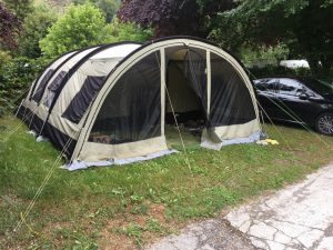 Zolang het water niet onder(of over) je grondzeil stroomt komt alles wel goed! Met zo’n grote tent kan je vast wel een droog plekje vinden. (ook voor de aanhanger) En tot slot, als je lichtbed weer leegloopt gewoon opblazen met je mond… Terwijl je erop ligt. Je valt flauw van de inspanning en wordt ’s morgens wakker. Praktisch!