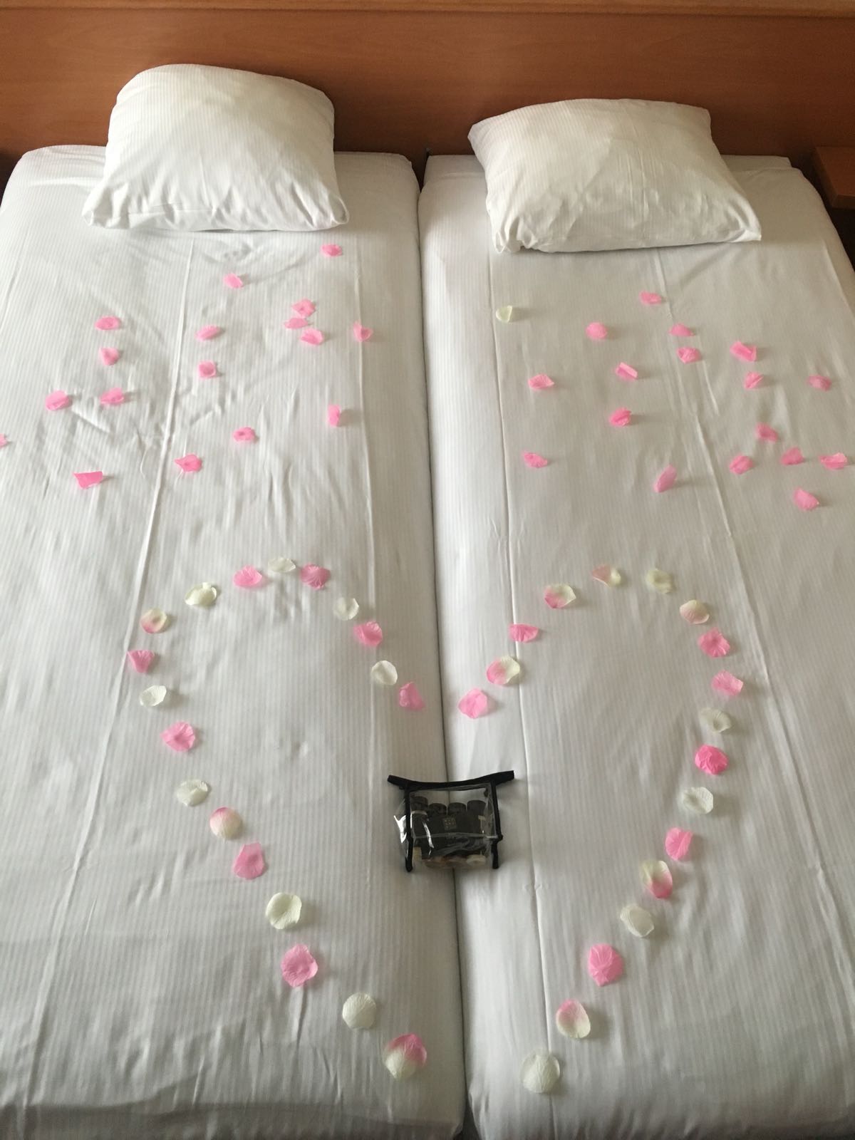 De rest van de dag verloopt redelijk rustig. We checken in bij het hotel en tot onze verbazing weten ze dat we een jubileum vieren. Ons bed is versierd met allemaal rozenblaadjes, zo lief! ‘S-avonds gaan we lekker eten in het dorp bij de Bovenmeester. Vooral de eend is echt een aanrader en Kitty is bang dat ik mijn enthousiasme niet meer kan inhouden. Ik besluit mij te gedragen.