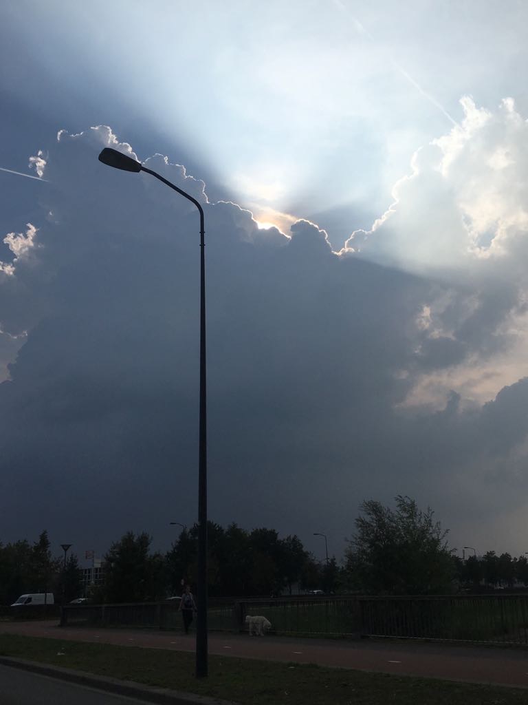 Daarna direct door voor de twee uurtje lesgeven en tijdens het eerste uurtje kwam ik zo’n mooie lucht tegen! Olga vond dat ik groot gelijk had om er een foto van te maken. Wat een geluksmoment is dat! Zo’n mooi afgetekende wolken met de zon erachter, prachtig! Een mooi cadeautje waar ik echt blij van word!
